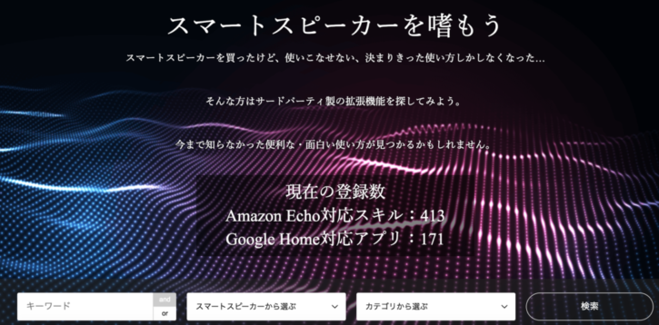 サイト公開とともにサービス第一弾として、スマートスピーカーの拡張機能を網羅的に検索できるページがオープンしました。